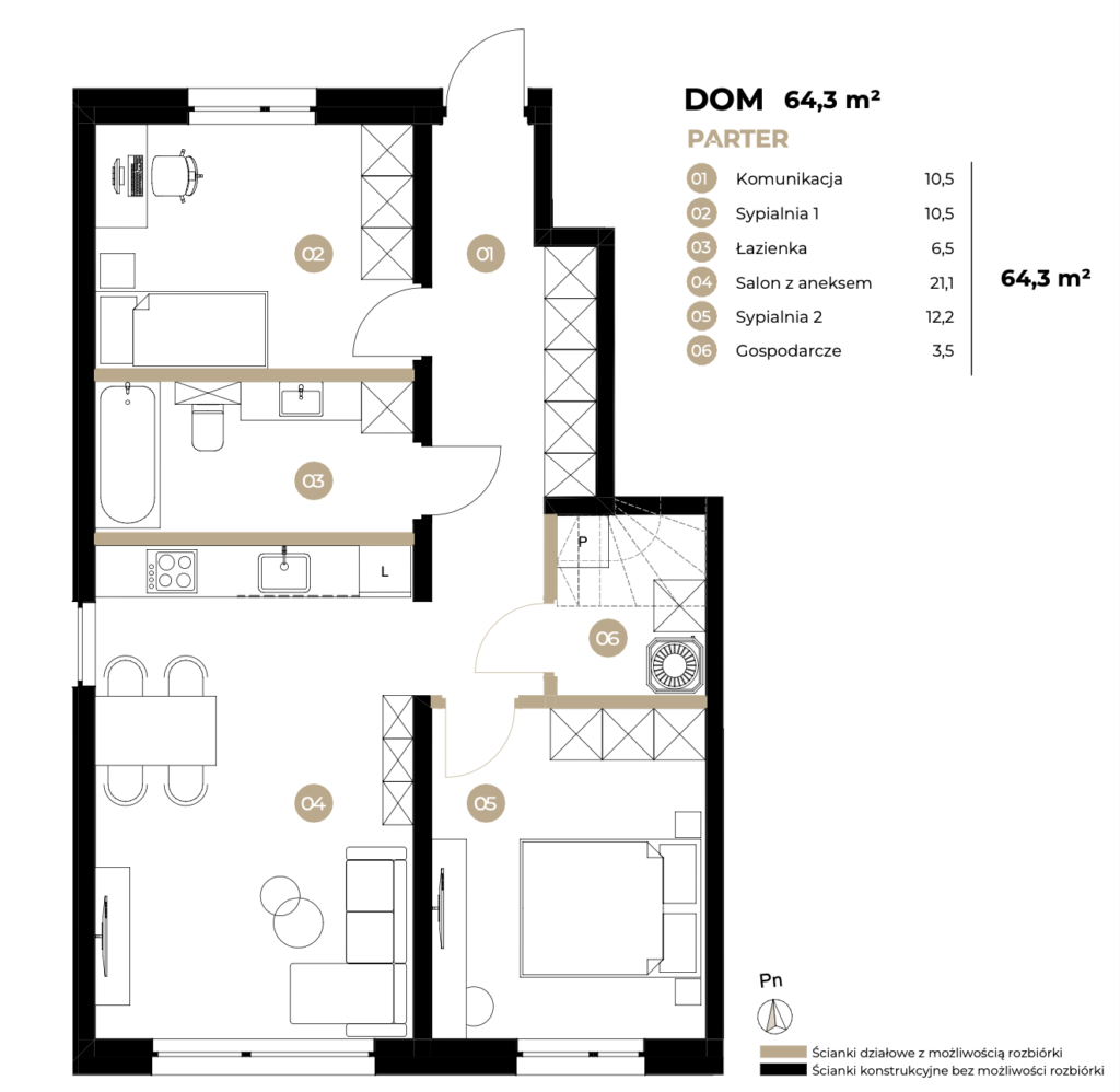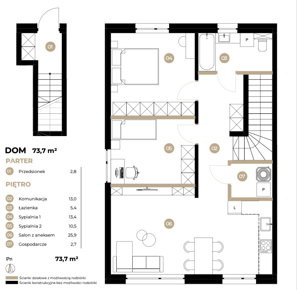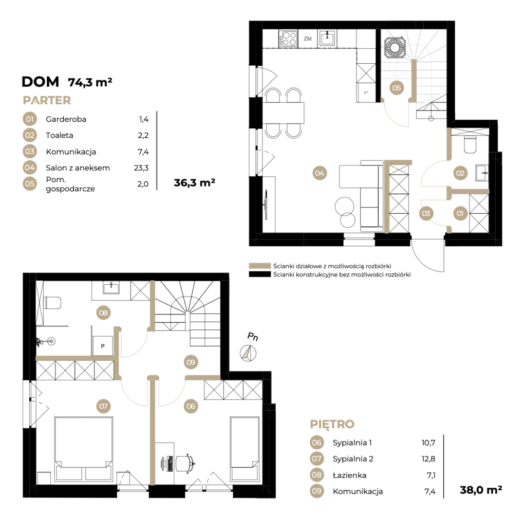 - Parter: salon z kuchnią + garderoba + toaleta