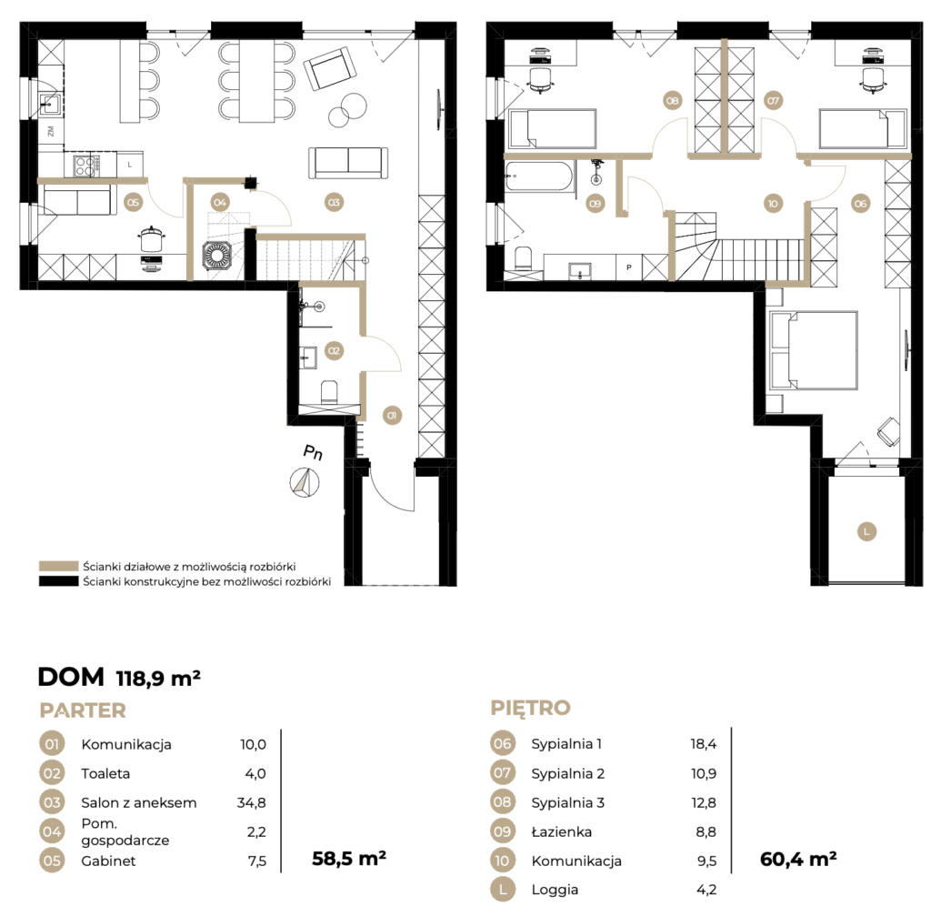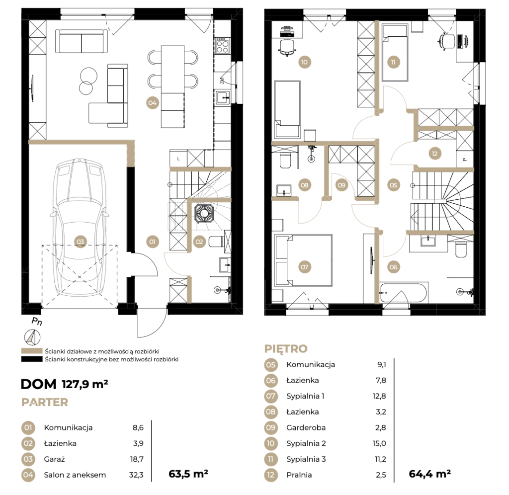 - Parter: salon z kuchnią + łazienka z prysznicem + gabinet + pom. gospodarcze