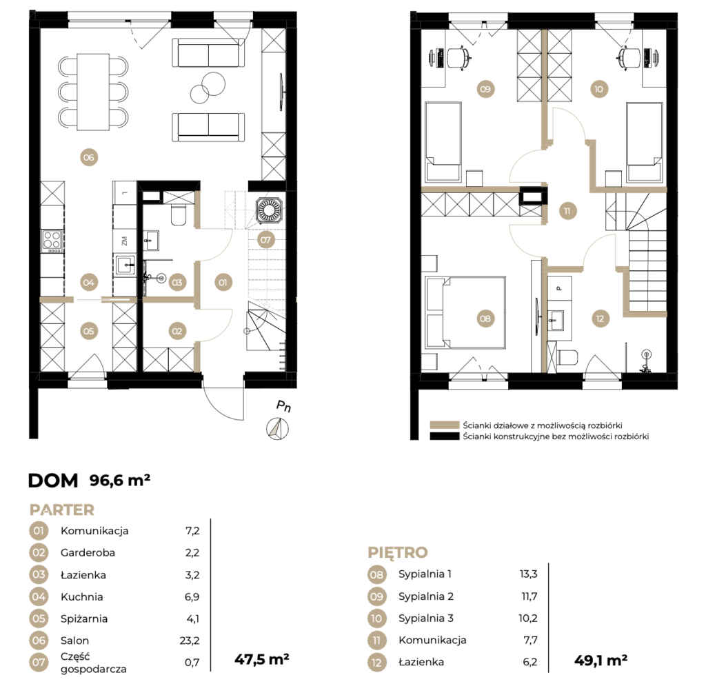 - Piętro: 2 komfortowe pokoje + 1 sypialnia z łazienką i garderobą + łazienka + pralnia + możliwość aranżacji poddasza